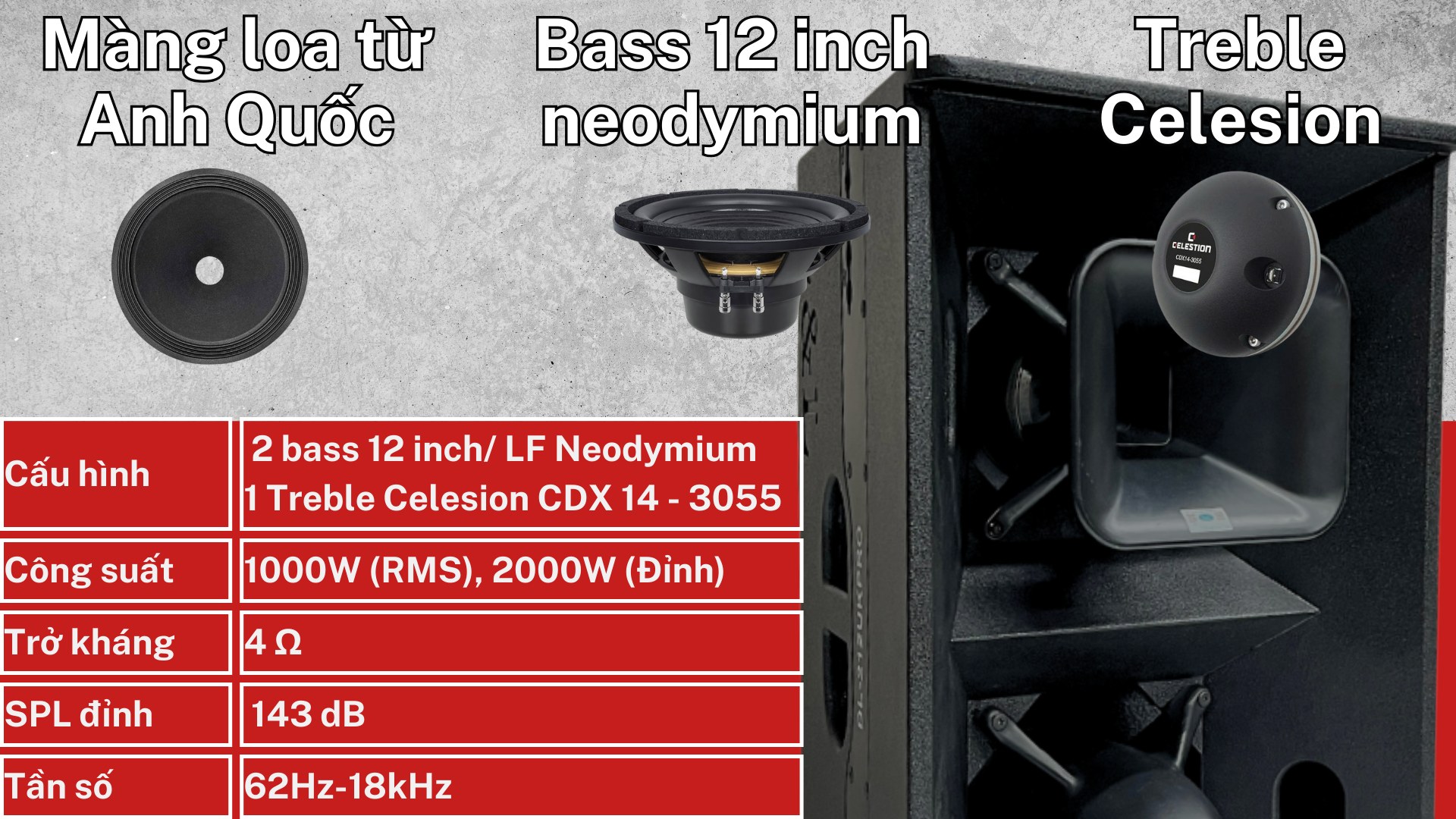 Bổ sung cho dải cao là một treble Celestion CDX 14-3055 – dòng driver đến từ thương hiệu danh tiếng của Anh, mang lại dải âm cao trong trẻo, chi tiết, hạn chế tối đa hiện tượng vỡ tiếng ở mức công suất lớn. Sự kết hợp này cho phép DL-212UK PRO hoạt động hiệu quả trong nhiều môi trường khác nhau, từ biểu diễn chuyên nghiệp đến hệ thống âm thanh lắp đặt cố định.