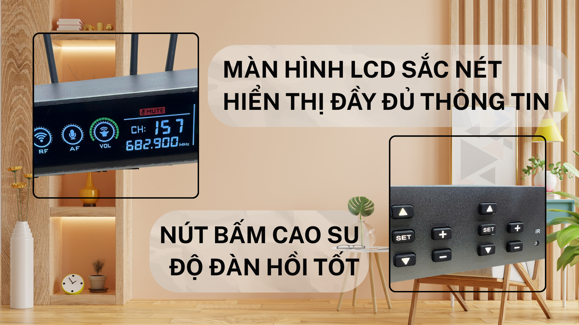 Màn hình LED sắc nét hiển thị đầy đủ thông tin: tần số, kênh, tín hiệu pin, cường độ sóng… giúp dễ dàng kiểm soát tình trạng hoạt động.
